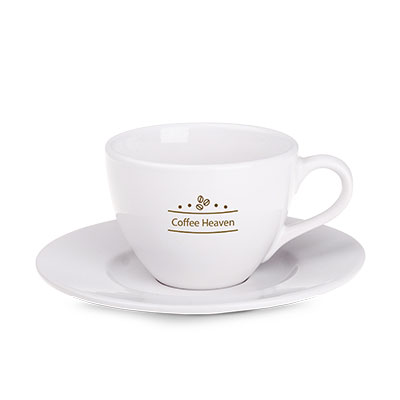 Ceramiczna filiżanka reklamowa o klasycznym obłym kształcie.