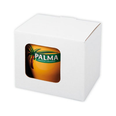 Opakowanie z okienkiem eksponującym nadruk na kubku od strony patrzącego.