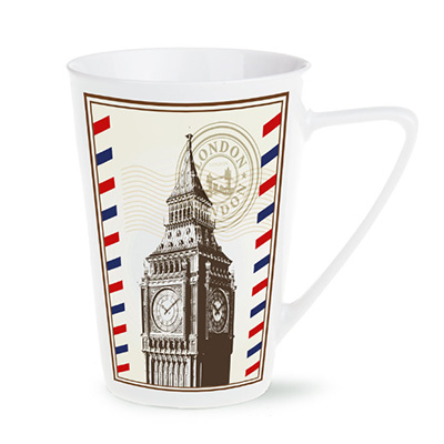 Pojemny kubek reklamowy z charakterystycznym, dużym uchwytem w kształcie trójkąta. Fason, którego cechą dominującą są wyraźnie zaznaczone krawędzie oraz kąty ostre.