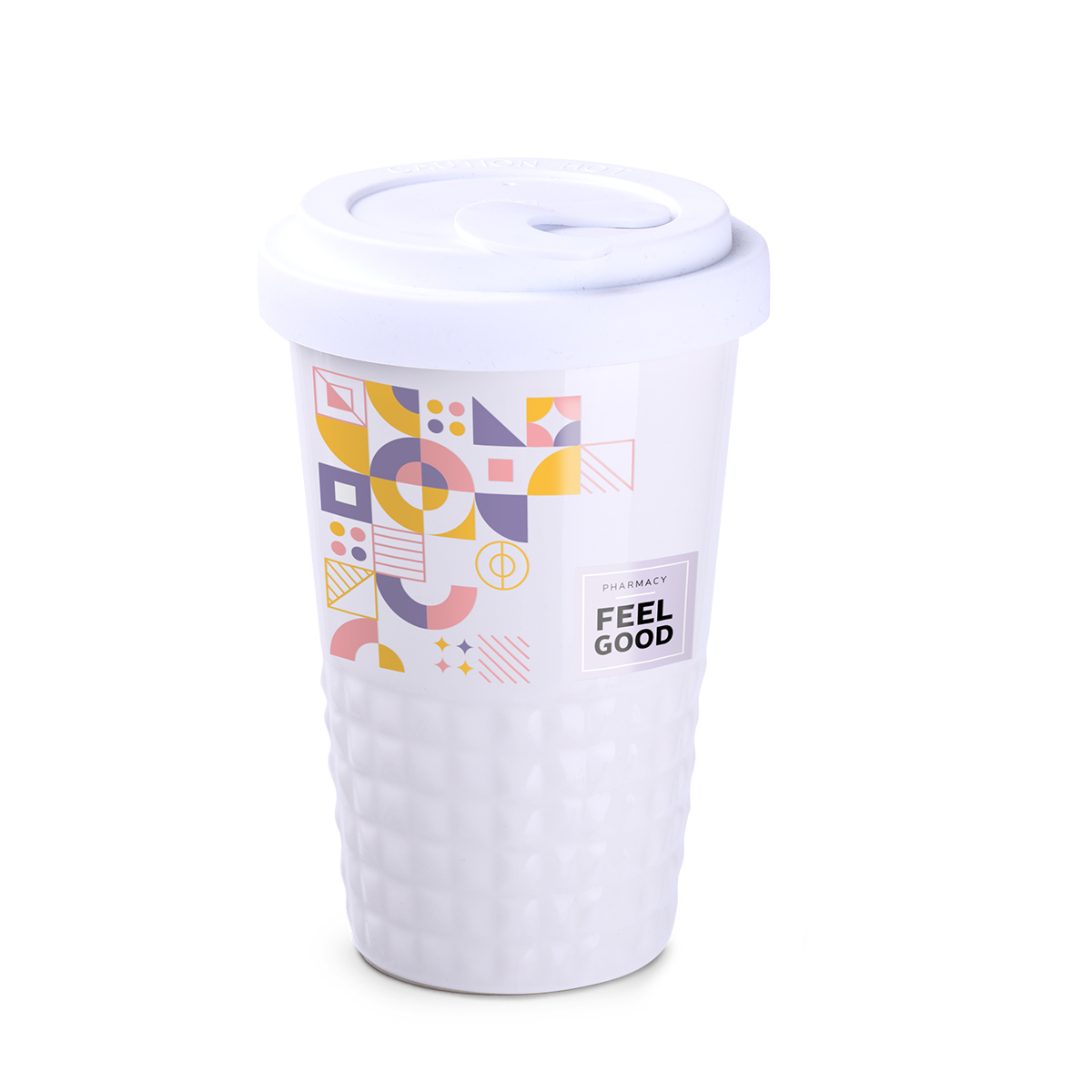 Nowość na rynku ceramiki reklamowej. Subtelne wykończenie dolnej części kubka w formie symetrycznych wypustek. Porcelanowy kubek dwuścienny, zapewniający doskonałą izolację ciepła. Wyjątkowo szczelna przykrywka. Model dla aktywnych. Przykrywka dostępna w następujących kolorach: biały, pomarańczowy 021C, szary Cool Gray 7, granatowy 294C, brązowy 4695C, czarny, różowy 4064C, niebieski 2144C, eucalyptus 5493C, desert sand 2310C